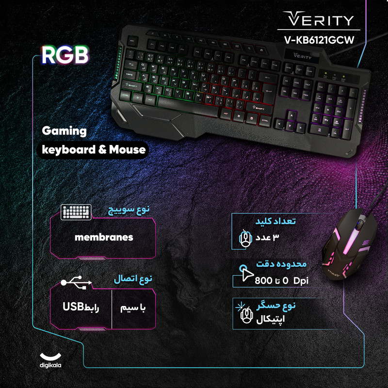 کیبورد و ماوس گیمینگ وریتی مدل V-KB6121GCW یک گزینه عالی برای گیمرها و کاربرانی است که به دنبال یک کیبورد و ماوس با نورپردازی RGB و کیفیت مناسب هستند. این کیبورد بهصورت Full-Size طراحی شده و دارای ۱۱۴ عدد کلید است که برای تایپ و بازی بسیار مناسب هستند. کلیدهای برجسته و طراحی قوسدار آن، تجربه تایپ و بازی را بهبود میبخشد و از خستگی انگشتان جلوگیری میکند. همچنین استراحتگاه مچ دست باعث راحتی بیشتر در استفاده طولانیمدت میشود. اتصال این کیبورد بهصورت سیمی و از طریق USB انجام میشود که تأخیر ورودی را به حداقل میرساند. این مدل از سوییچهای ممبران بهره میبرد که عملکردی نرم و بیصدا دارند. همچنین از ویژگی Anti-Ghosting پشتیبانی میکند که مانع از بروز مشکلات هنگام فشردن چندین کلید همزمان در بازیهای حرفهای میشود. ماوس همراه این کیبورد دارای ۳ کلید اصلی و حسگر اپتیکال با دقت ۸۰۰ dpi است که برای استفاده روزمره و بازیهای سبک، عملکردی مناسب ارائه میدهد. طراحی ارگونومیک آن باعث راحتی در استفاده میشود و نورپردازی ترکیبی آن جلوهای زیبا به آن میبخشد. علاوه بر گیمینگ، این مجموعه به دلیل کیفیت ساخت مناسب و طراحی جذاب، برای ادارات، کافینتها، دفاتر پیشخوان و مدارس نیز گزینهای ایدهآل به شمار میرود.