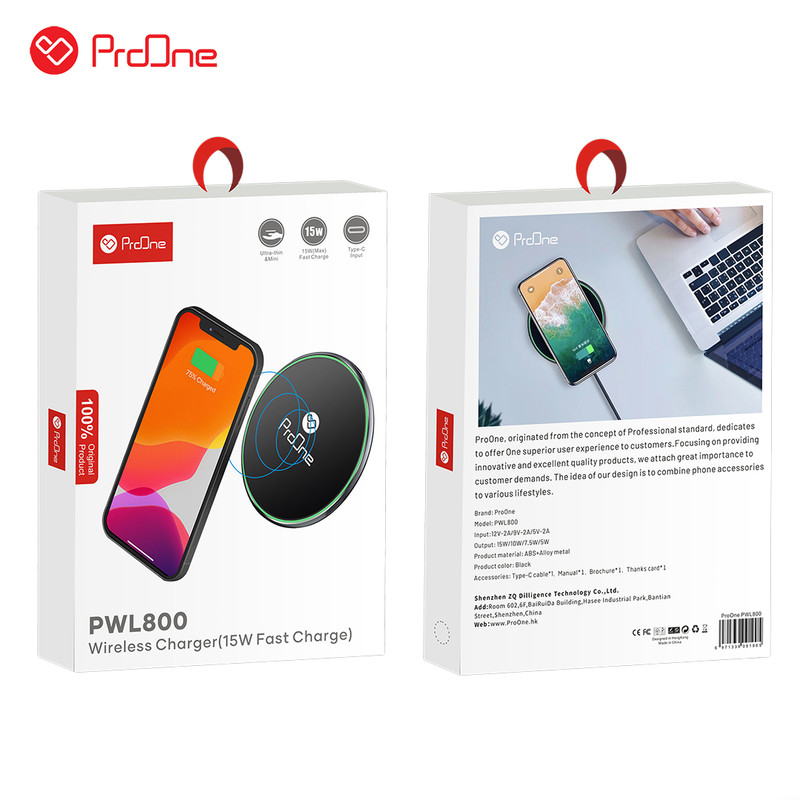 شارژر بی سیم PWL800 یکی از محصولات شرکت «Proone » است. این شارژر در ابعادی به طول و عرض 5/10 و ارتفاع 2 سانتی متر است. شرکت پرووان برای ساخت بدنه این دستگاه از آلیاژ آلومینیوم استفاده کرده است و در زیر این شارژر یک حلقه پلاستیکی قرار گرفته تا از افزایش استحکاک و لیزر خوردن شارژر جلوگیری کند. در لبه ها چراغ های LED کوچکی تعبیه شده است که با توجه به آن می توان از وضعیت دستگاه آگاه شد. شارژر PWL800 پرووان از شارژ 5 وات تا 15 وات را پشتیبانی می کند و شدت جریان خروجی این شارژر 2 آمپر است. این شارژ بی سیم از نوع Fast می باشد که همراه این محصول در جعبه یک کابل Type-c Fast قرار دارد .