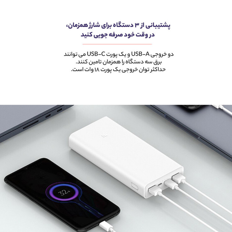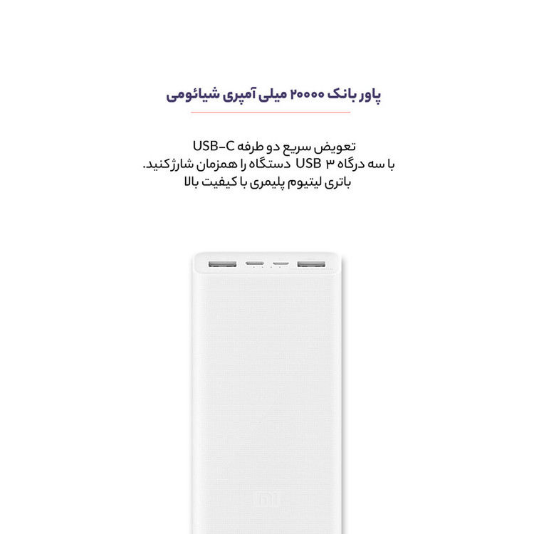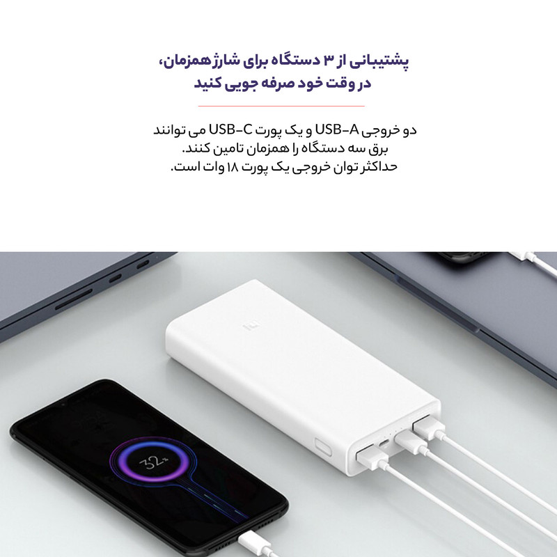 پاوربانک شیائومی مدل PLM18ZM ظرفیت ۲۰۰۰۰ میلیآمپرساعت – شارژ سریع دوطرفه ۱۸ وات با ۳ پورت خروجی!