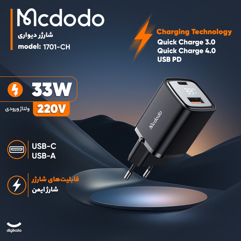 شارژر دیواری ۶۷ وات مک دودو مدل CH-4100 به همراه کابل متصل USB-C – شارژ سریع سهگانه با GaN و نمایشگر دیجیتال!